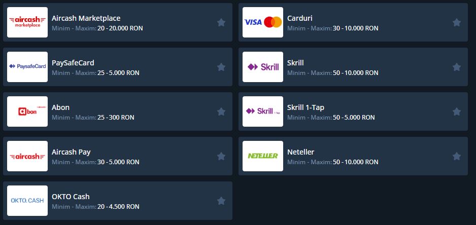 | Paysafecard | 25 RON | 5000 RON | Instant |