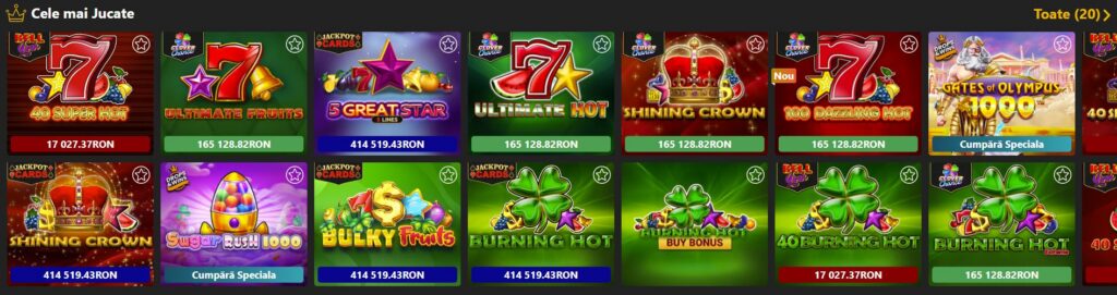 În partea de sus a secțiunii Cazino se găsesc mai multe opțiuni de filtrare pentru jocuri: Cele mai jucate, Jocuri noi, Cumpără speciale, Jocuri cu fructe, Megaways și multe altele. Iar cu cât navighezi în partea de jos a acestei secțiuni, cu atât dai de mai multe categorii de jocuri.