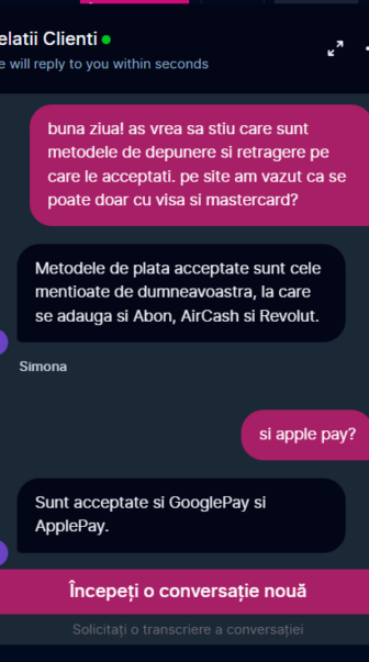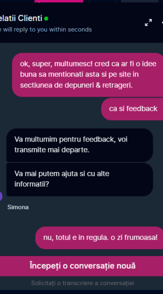 - Live Chat: Procesul începe prin solicitarea e-mailului și a CNP-ului pentru identificare. Inițial, ești întâmpinat de un asistent virtual cu răspunsuri standard, dar poți solicita imediat transferul către un agent. Noi am fost preluați în aproximativ 3 minute. Operatorul a fost extrem de profesionist și deschis la feedback, în special când am semnalat confuzia creată de metodele de plată afișate pe site.