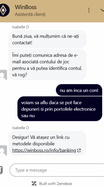 | Live Chat (bot → operator) | Română | Poți alege din listele botului sau ceri transfer la operator; transfer ~5 minute. Operatorul a fost util, politicos, a oferit informații chiar și fără cont activ (a cerut e-mail pentru identificare, dar a răspuns și fără). |