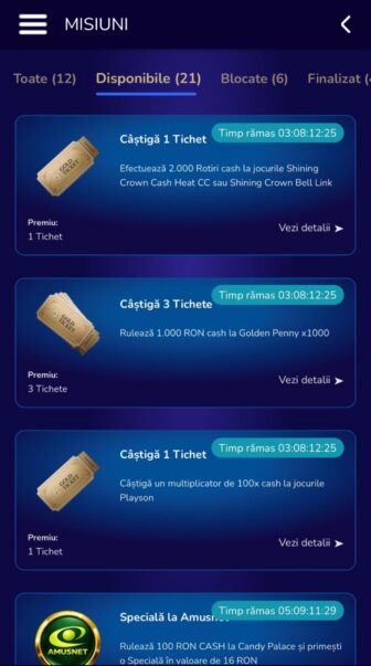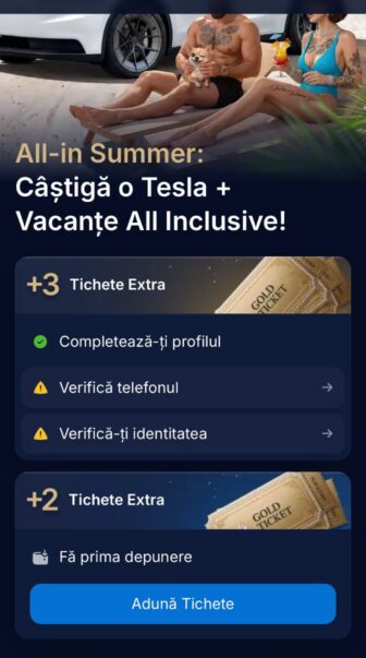 - Mai multe moduri prin care strângi tichete: verificare cont, prima depunere, misiuni, jocul săptămânii, boostere