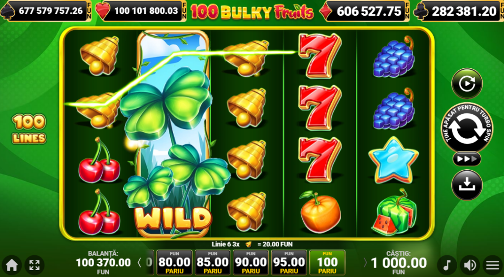 Pe role vezi toată galeria: cireșe, lămâi, portocale, prune, struguri și pepeni, clopoțelul auriu, șeptarul roșu și două Scattere care plătesc „oriunde”. Trifoiul cu patru foi joacă rolul de Wild și face toată munca invizibilă: completează linii, salvează combinații, ține pulsul jocului. Interfața e curată, cu fundal verde și simboluri cubice bine conturate, exact cât trebuie ca să nu obosească.