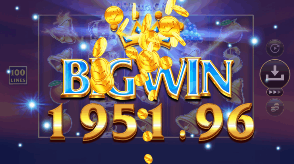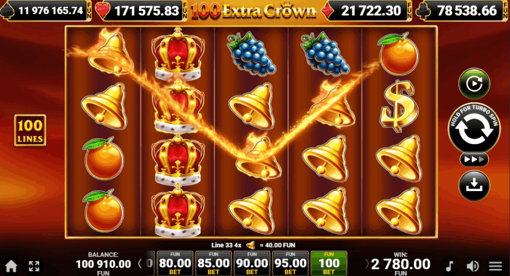 100 Extra Crown demo pune coroana pe un format clasic de fructe și îl întinde la scară mare: 5 role × 4 rânduri și 100 de linii fixe. Din prima rotire simți ritmul alert fără să aștepți o specială, pentru că jocul nici nu are una. În loc de rotiri gratuite, baza e formată din: Wild-uri Coroană care se extind pe rolele centrale, două tipuri de Scatter cu plăți „oriunde” și misteriosul Jackpot Cards care poate declanșa un progresiv în orice moment.