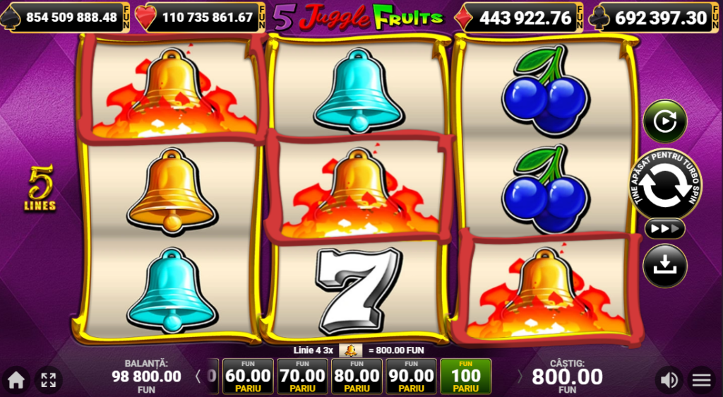 Deși are un RTP de 95.9% și o volatilitate medie, 5 Juggle Fruits se simte mult mai „năbădăios” decât alte sloturi cu 3 role. Asta se datorează funcției de Jonglare. Dacă reușești să umpli toate cele 9 poziții cu același tip de simbol (de exemplu, toate șapte sau toți clopoțeii), jocul face o jonglerie: transformă simbolurile de culori diferite în cea mai valoroasă variantă a lor și îți dă un multiplicator de x2. E momentul ăla în care ecranul mic explodează în câștiguri mari.