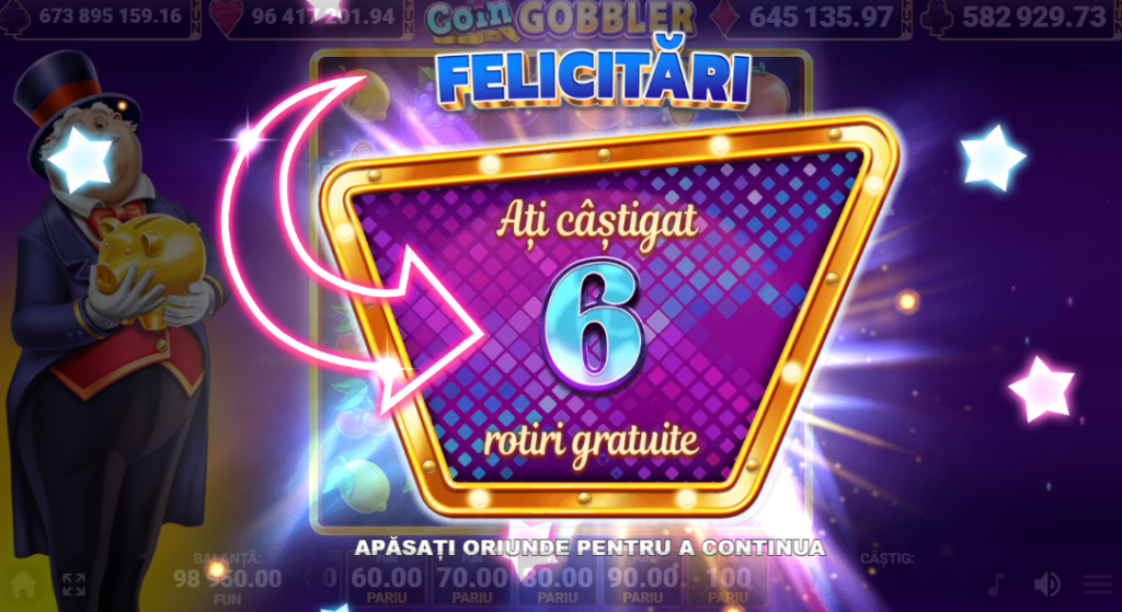 RTP-ul este 96,27%, volatilitatea tinde spre medie–înaltă, iar mizele acoperă confortabil majoritatea bugetelor (≈ 0,20–100 RON). Vizual, e curat și colorat; mascota – un „strângător” simpatic – ține locul de Wild și dă personalitate ecranului fără să obosească.