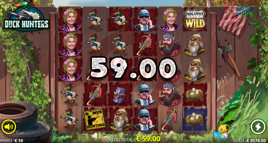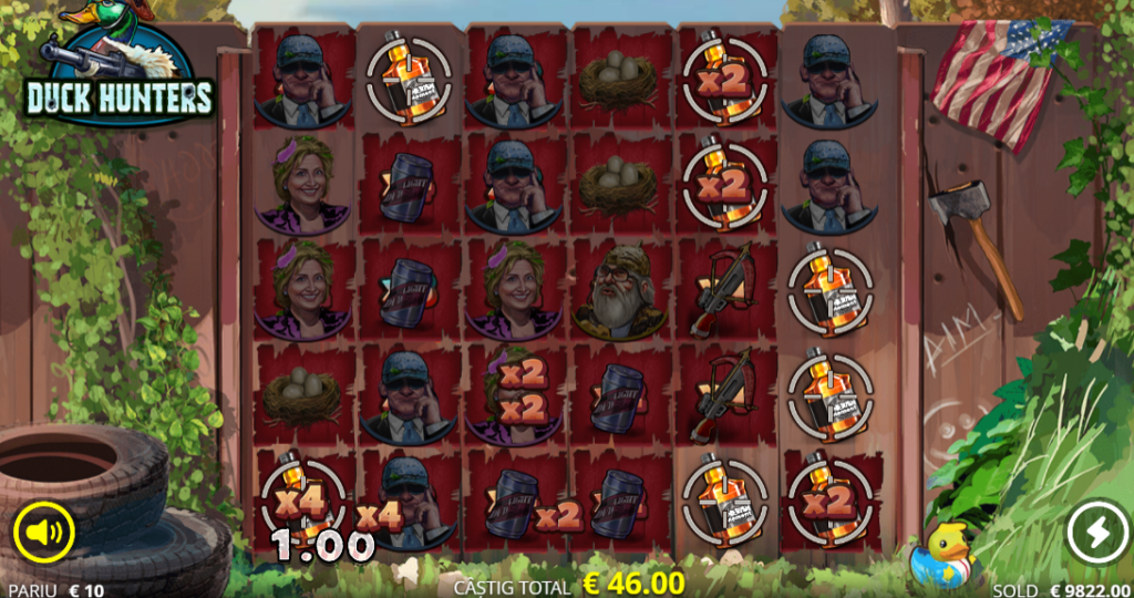Umorul mușcă fără a trece în grotesc, iar animațiile țin ritmul cu explozii, xWays care „umflă” simbolurile și multiplicatori care cresc pe poziții după fiecare cădere. Coloana sonoră e corectă, cu accente care subliniază cascadele, iar atmosfera de „vânătoare de rațe” se împletește cu ironii la adresa culturii pop americane. Sub glumițe, însă, jocul livrează cifre serioase: câștig maxim de 30.000× miza.