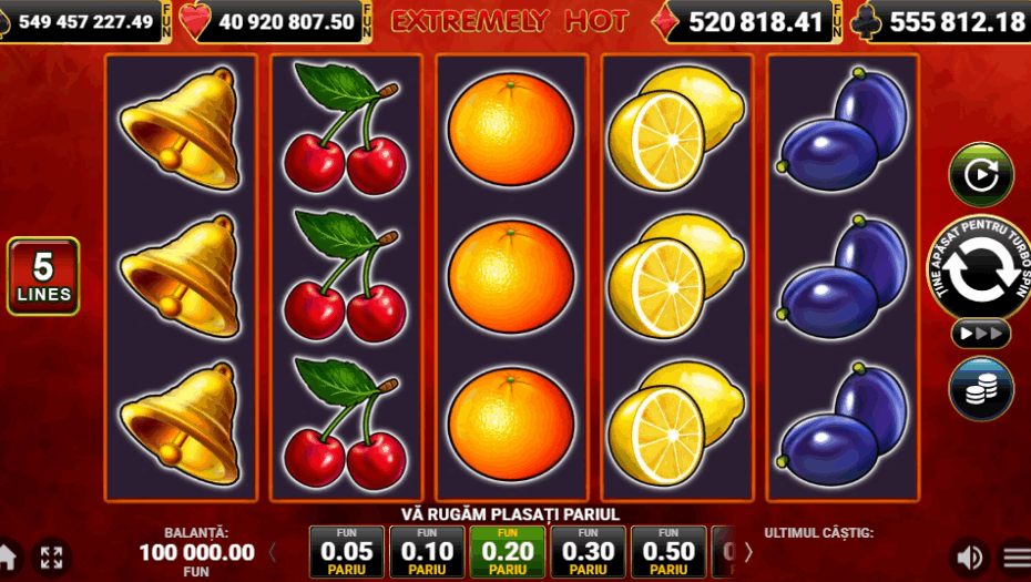 Dacă ai crescut cu jocuri cu fructe clasice, în Extremely Hot demo (Amusnet) regăsești același ritm: cinci role, cinci linii, plăți directe și mult șeptari. Simboluri mari, conturate gros, și o paletă roșiatică care parcă încălzește ecranul după câteva minute.