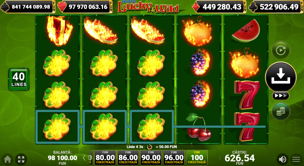 More Lucky and Wild e un slot pentru cineva care vrea acțiune fără complicații. Nu ai rotiri gratuite, nu ai povești cu pirați sau zei, ai doar matematica pură a celor 40 de linii și speranța că trifoiul ăla o să apară fix între doi șeptari.
